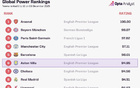 Opta全球俱乐部当前实力榜:阿森纳、拜仁、巴黎前3,维拉第6